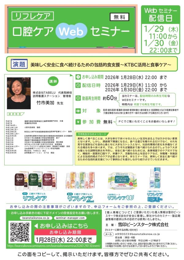 日時:2026年1月29日(木)11:00~30日(金)22時(再生時間約60分)講師:株式会社TABELU 代表取締役 訪問看護ステーション 管理者 竹市美加先生