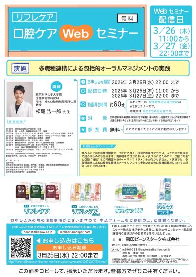 日時:2026年3月26日(木)11:00~27日(金)22:00(再生時間約60分)講師:東京科学大学大学院 医歯学総合研究科 地域・福祉口腔機能管理学分野 教授 松尾浩一郎先生